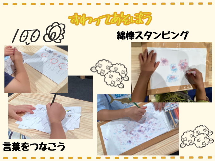 季節感を感じ、表現を楽しむことをねらいとして綿棒スタンピングで紫陽花を描きました。スタッフが写真を見せながら紫陽花の咲く時期や梅雨についての説明をして、その後取り組みました。画用紙いっぱいに大きな紫陽花を描く子、小さな紫陽花を複数個描く子、思い思いに自分の綺麗だと思う紫陽花を描いています。紫陽花の真ん中と周りで色を変えてみたり、写真で見たように葉脈のしっかりした葉っぱをたくさん描いたり、それぞれのこだわりがみられ、素敵な作品が完成しました✨