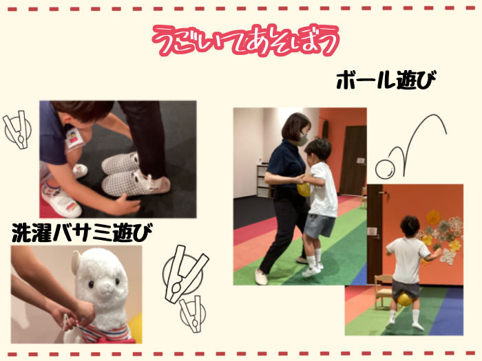 手先の巧緻性やボディイメージを高めることを狙いに洗濯バサミを使って遊びました。体につけられた洗濯バサミを探す『体探しゲーム』では、スタッフと子どもたちと交代で行いました。自分の体を探すときには目を閉じたまま全身を隅々まで触り一生懸命探しています。スタッフの体につける番になると、「いひひ」と笑いながら、お尻の近くにたくさんつけてみたり、ズボンの裾など手から遠いところにつけてみたり、ちょっぴりイタズラ心を持って楽しんでいました( *´艸`)お部屋の中での洗濯バサミ探しでは、色の似たものに洗濯バサミをつけ、見つけにくい工夫をする姿もみられました!