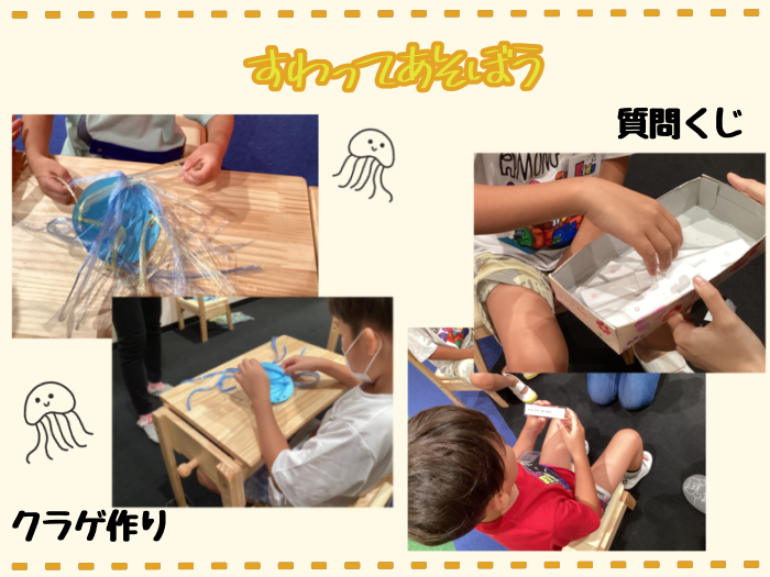 涼しげで夏らしい製作…ということでクラゲの製作をしました。固結びの経験を持つことやスズランの割ける感触を楽しむことをねらいとしています。穴にスズランを通して結んで…はじめは「どうやるん?」とスタッフに尋ねながらしていましたが、何度か繰り返していくうちに自分で固結びをすることができました!自分で結ぶのがまだ難しい子どもたちには、スタッフが結んだスズランを割いてもらいました。スズランが割けていく様子をじーっと見つめ、繰り返して楽しんでいます。どんどん細く細く割き、脚がたくさんのクラゲが完成!手で持ってツクルKidsの中ふわふわ〜っと泳がせる姿がかわいらしかったです。