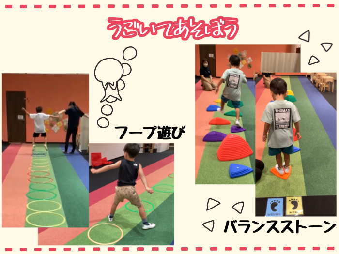 バランス感覚や自分の体を思うままに動かす力を養うことをねらいにフープ遊びをしました。最初は縦一列に並んだフープの中を両足ジャンプでどんどん進んでいきます!その次は1つ飛ばしでジャンプ!「こんなん簡単〜」と余裕を持って取り組んでいました。「今度は手も一緒に動かすよ」とスタッフが話すと、「えぇ?!」とちょっと戸惑いを見せながらも、スタッフのお手本をよくよく見て真似っこ!「足がグーの時は手はパーで…」「両足で飛んだ次は片足で…」と頭も体もたくさん動かして遊びました。