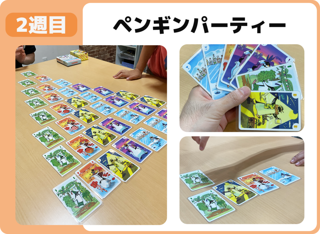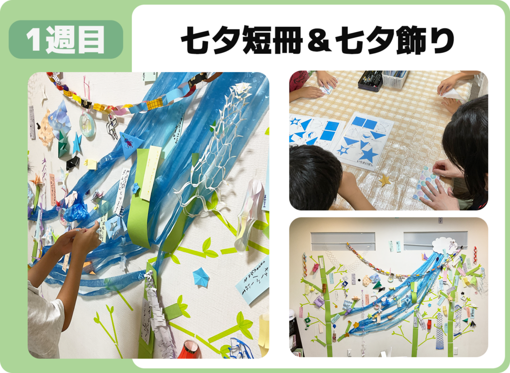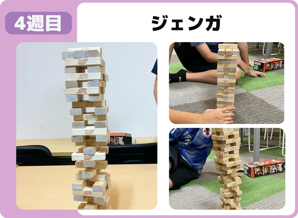 今月は、七夕飾りづくりにはじまり、カードゲーム「ペンギンパーティー」や覚えて伝える人間コピー機、ジェンガのドキドキチャレンジ、さらには五感を刺激するセンサリーバッグ制作まで、多彩な活動を行いました。