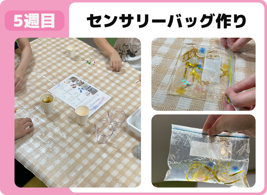 物の計量学習としてセンサリーバッグ作りに取り組みました。分量を量り、自分の好きな飾りを入れて、自分だけのオリジナルを完成させました。