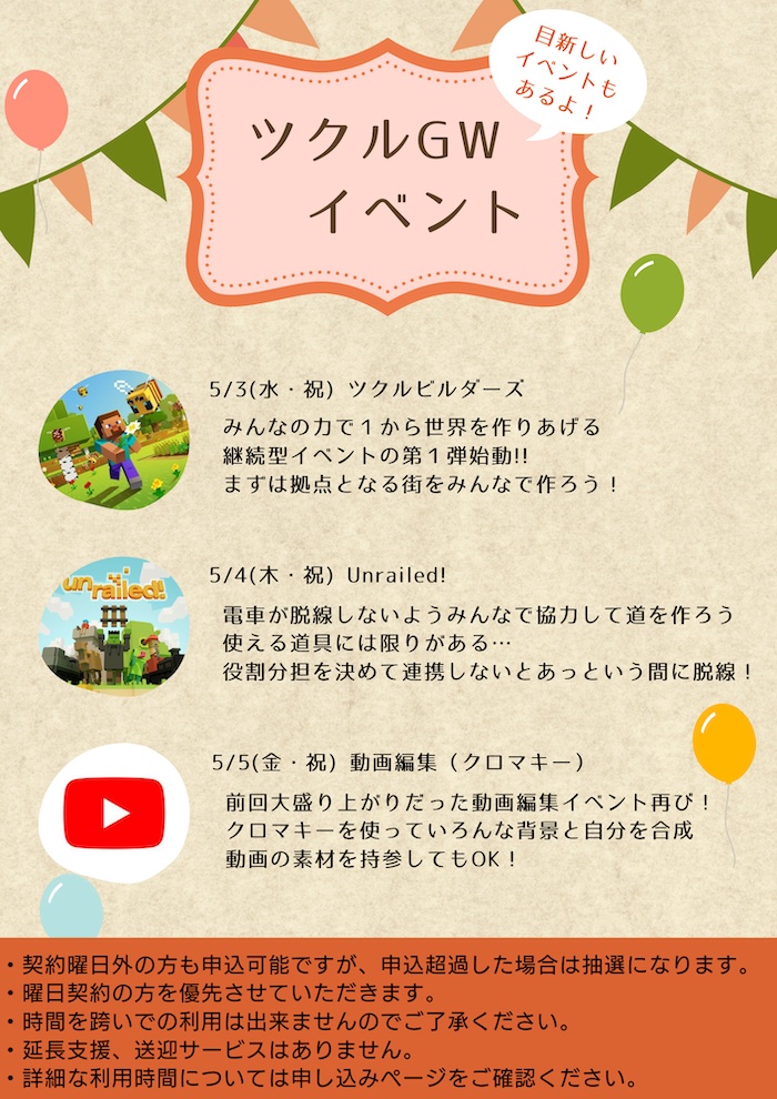 5月はツクルビルダーズ、unrailed!、動画編集(クロマキー)のイベントを開催予定です!