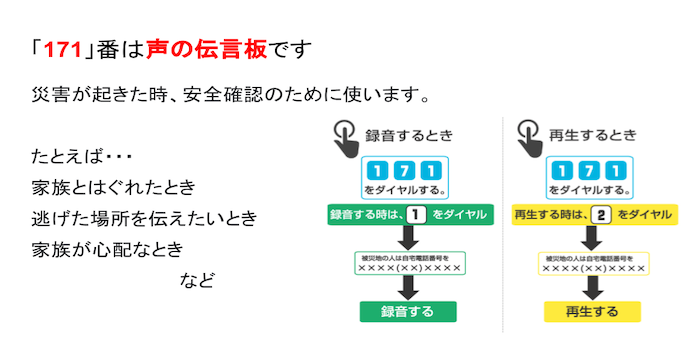 171番は「声の伝言板」と言われる物で携帯電話が使えない時に、安全確認のために使える便利なツールです!
