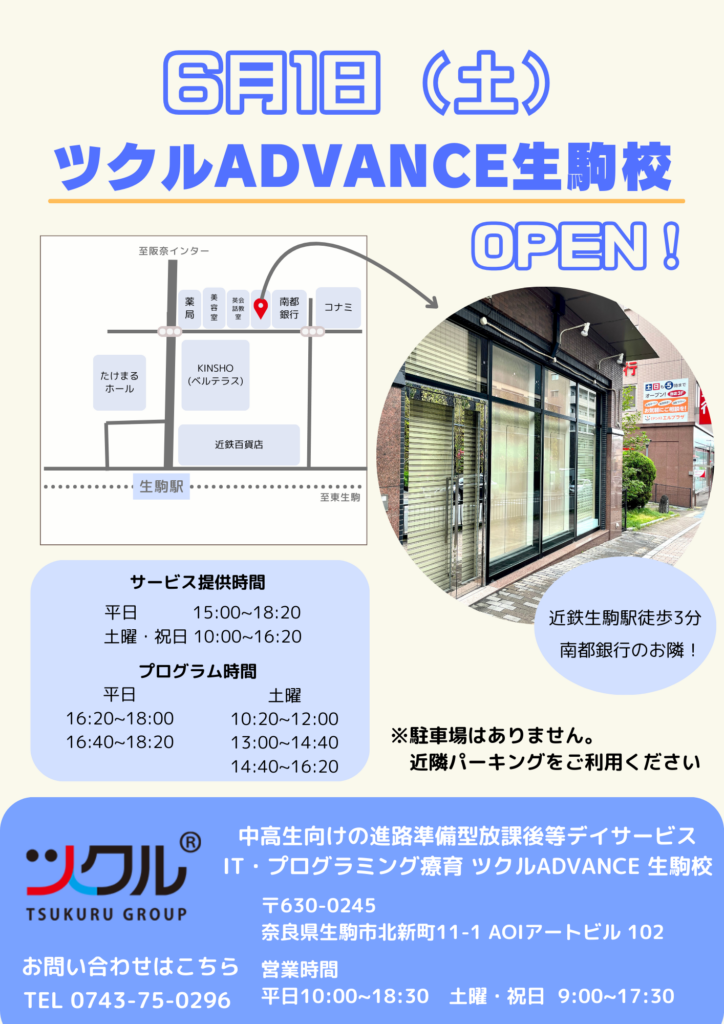 6月からツクルfarm がツクル生駒校と合併し、ツクルADVANCE生駒校が生駒駅の近くにオープンします!