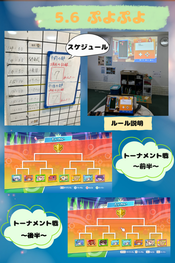 ツクル俵口でのぷよぷよ王者を決めよう!という趣旨のイベントで、最初にスポーツマンシップに則ること、ルールを守ることをみんなで約束し、トーナメント戦を行いました。