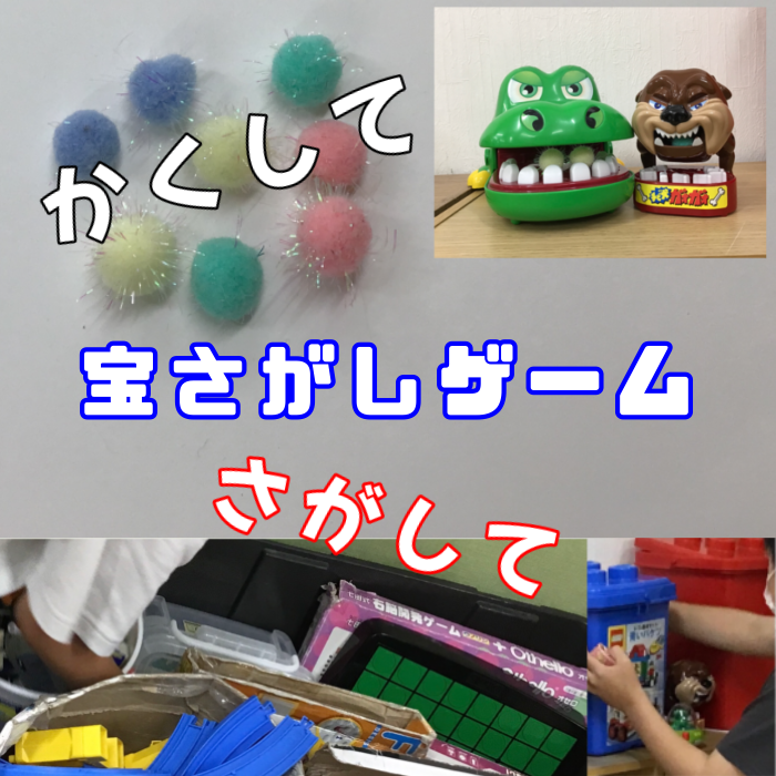 隠すチームと探すチームに分かれて、小さなボールを一人2つずつ隠して、探してもらいます。制限時間2分間の間に見つかりにくい場所を探して隠していました。探すチームは、手分けして「こっち探すわ」「どこやろ、ないで」と隅々まで探しています。ヒントをもらって「あったー!!」見つけた時の嬉しそうな表情、最後まで見つからずに「やったぞ」という満足した表情。みんな楽しく活動に参加していました。