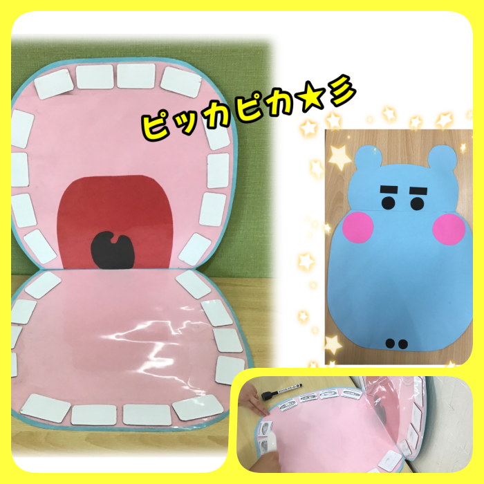 動画を見て、歯磨きの大切さを知り、模型の「カバ」を使って実際に歯磨き体験をしました。