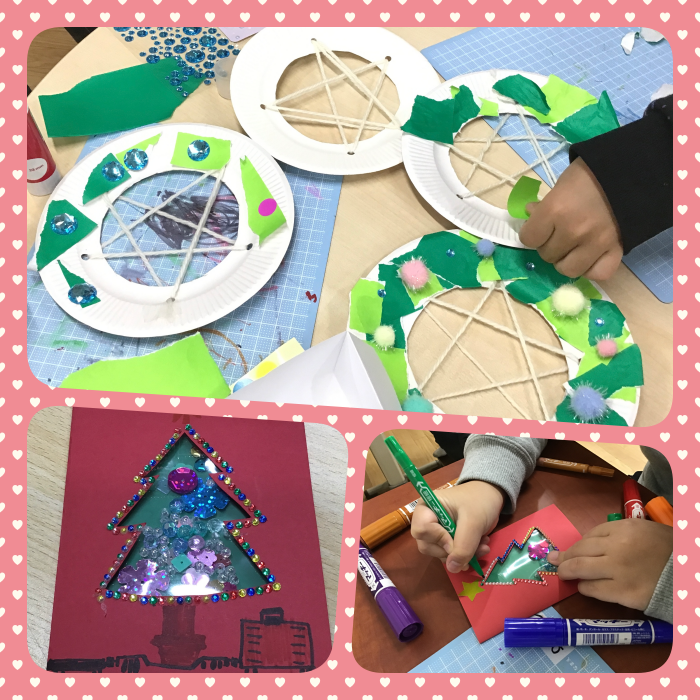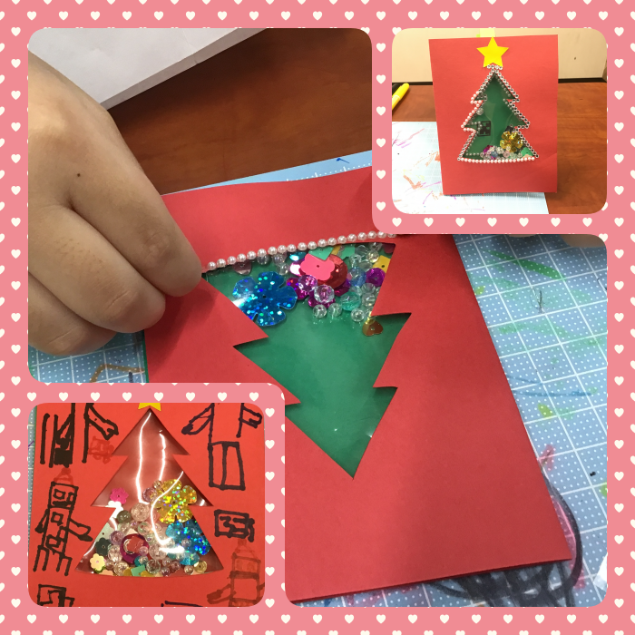 クリスマスツリーの形をした画用紙の周りを小さなビーズシールで装飾したり、絵描いたりと、それぞれが自分の思いを表現した作品創りに夢中になりました。