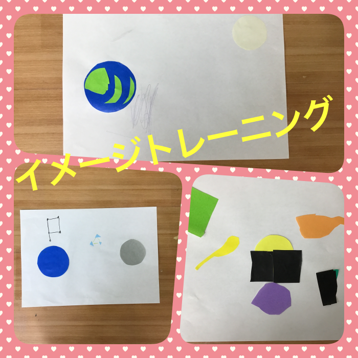丸、三角、四角の折り紙からイメージするものを描きました。