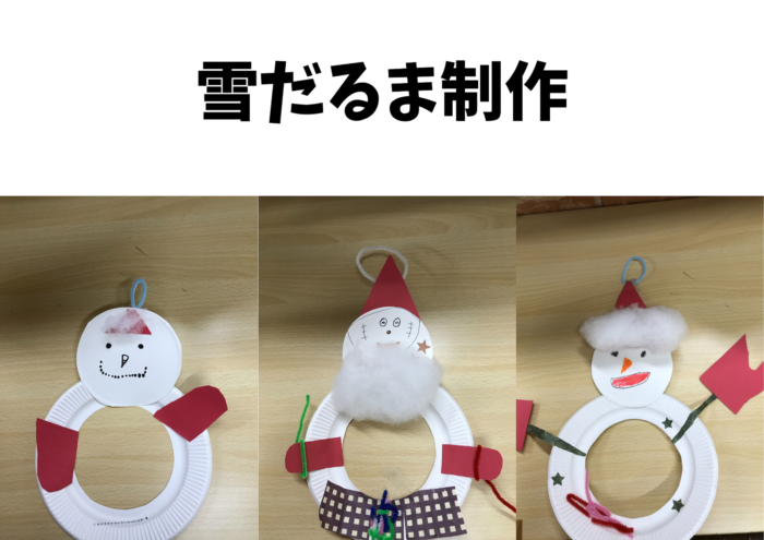 「雪だるま制作」を行いました。支援員の話をしっかりと聞き、「どんなのにしようかな?」と迷いながらもとても楽しそうに雪だるまを作る事が出来ました。白い綿にのりをつけるのが難しい様子でしたが、紙にのりをつけてから貼るなど工夫する場面も見られました。他にもビンゴやフルーツバスケットに挑戦し、クリスマスを楽しく過ごす事が出来ました。最後にはクリスマス限定ガチャもありました!