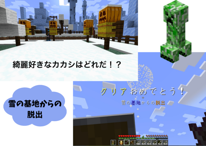 マインクラフトで「雪の基地からの脱出」という特別なワールドに取り組みました。始めは「難しそう」と話す児童もいましたが、次第に操作にも慣れてきて、児童同士でアイテムの貸し借りをするなどみんなで協力し、声を掛け合いながらゴールを目指す事が出来ました。年末最後のイベントに、参加者全員「楽しかった!」と大変満足気でした。