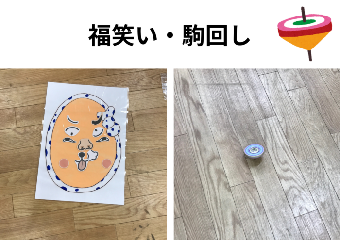 福笑いやカルタ、コマ回しなどに取り組みました。