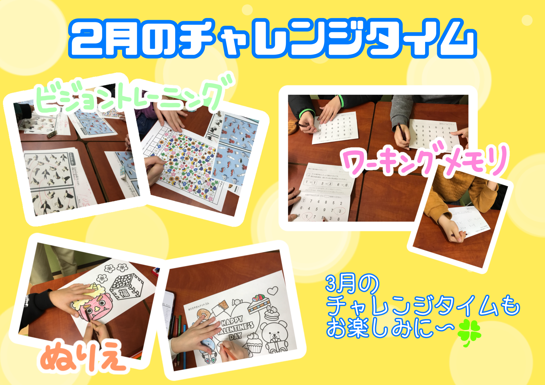 2月に取り組んだ感覚統合訓練(ミラクルタイム)と生活スキル向上訓練(チャレンジタイム)、防災訓練の紹介です✨