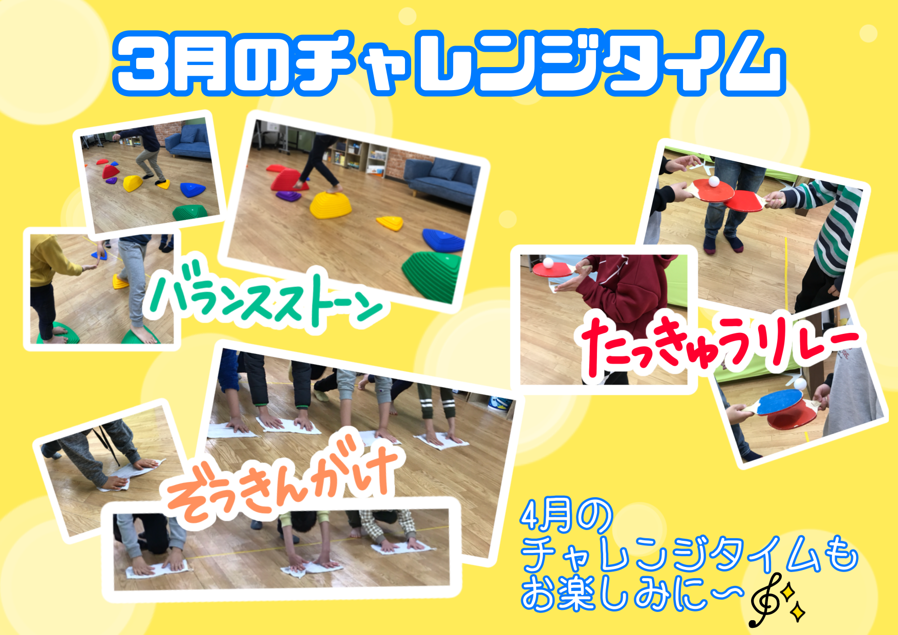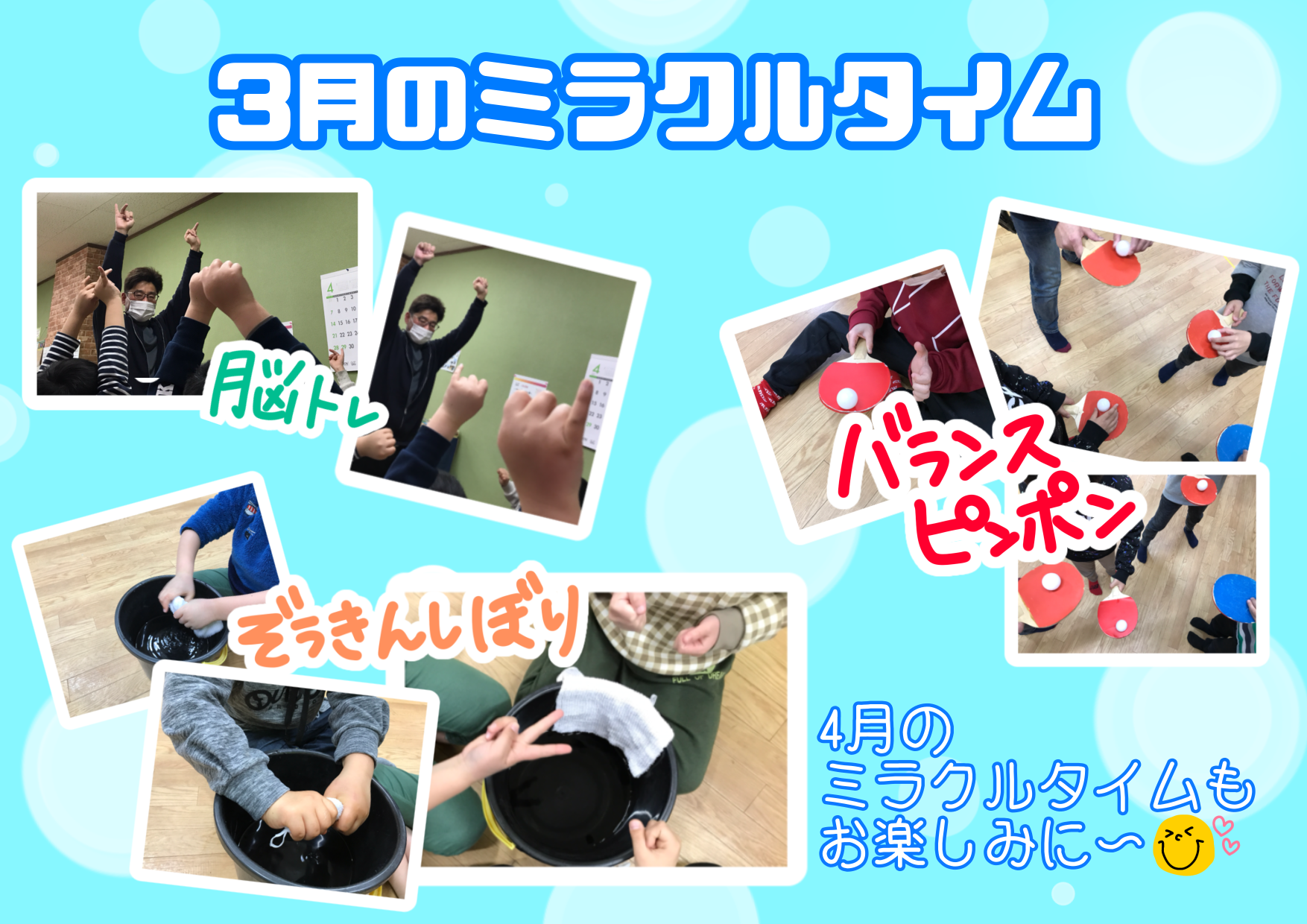 3月に取り組んだ感覚統合訓練(ミラクルタイム)と生活スキル向上訓練(チャレンジタイム)の紹介です✨
