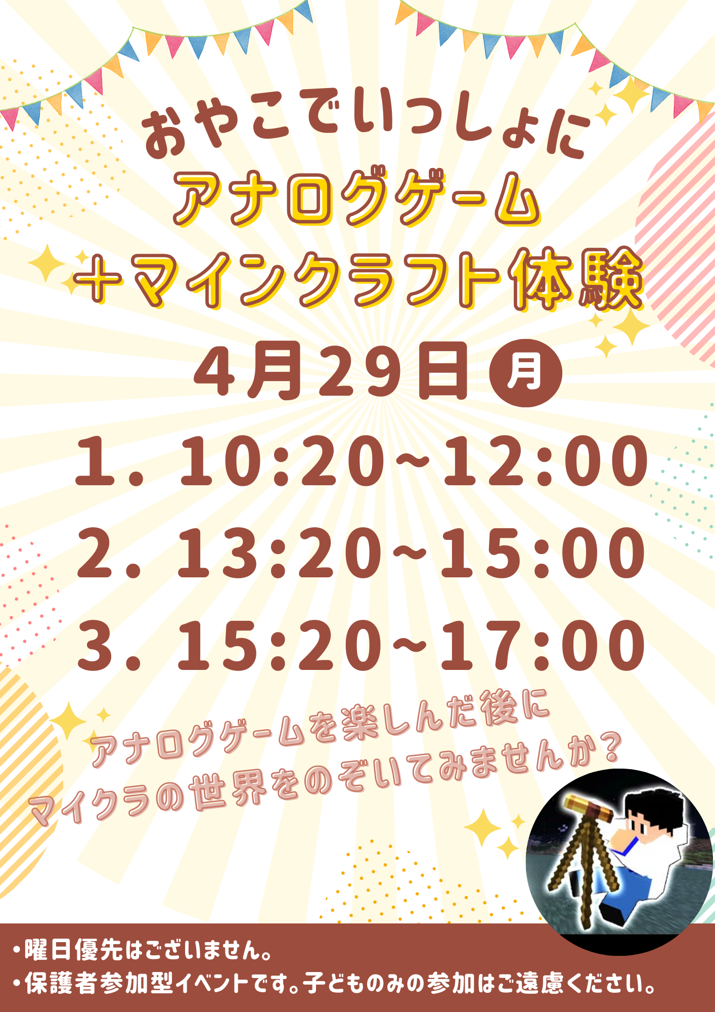 【親子で一緒にボードゲーム+マインクラフト体験】 を予定しております♬