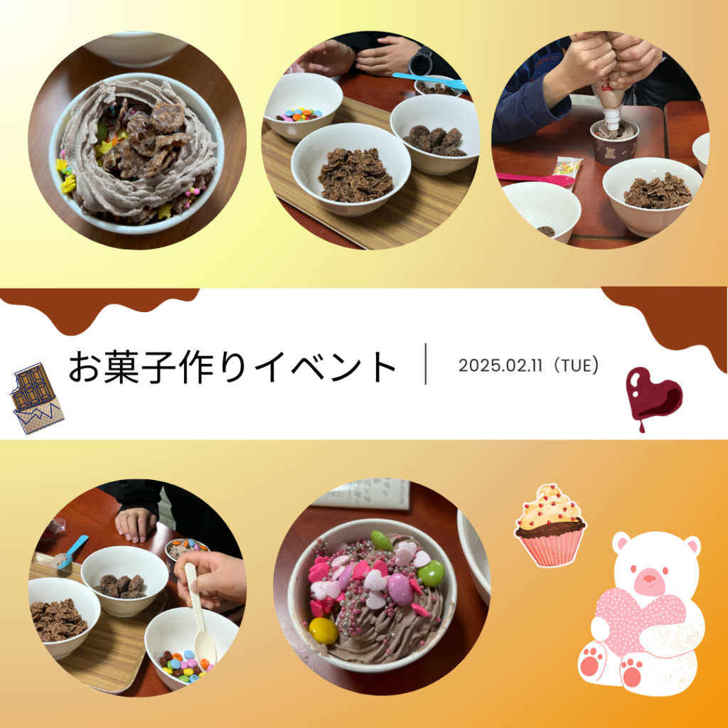 バレンタインデーにちなんで、チョコレートを使ったパフェを作りました。好きなお菓子を選んで、チョコクリームやアラザン等をトッピングしました。完成したものを見て、満足げな様子でした❤(*´∀`)♪