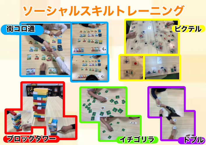 今月のSST(ソーシャルスキルトレーニング)では、街コロ通やピクテル、ブロックタワー、イチゴリラ、ドブルというゲームに取り組みました✨どのゲームもお友達とコミュニケーションを取りながら、楽しく取り組むことが出来ています♪