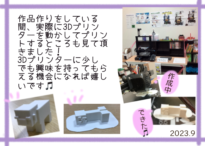 モデリング完成後、マジカボクセルの画面をポストカードに印刷して持ち帰って頂きました。作品のお渡しは後日になりますがみんな「印刷できるのいつ?」と楽しみにしてくれている様子でした。