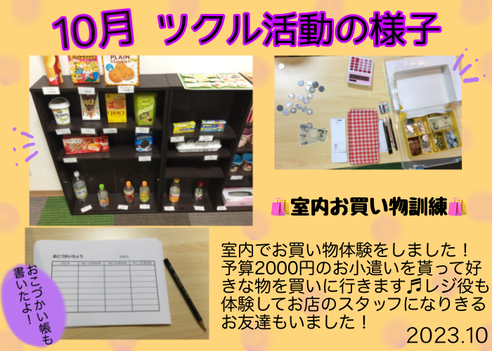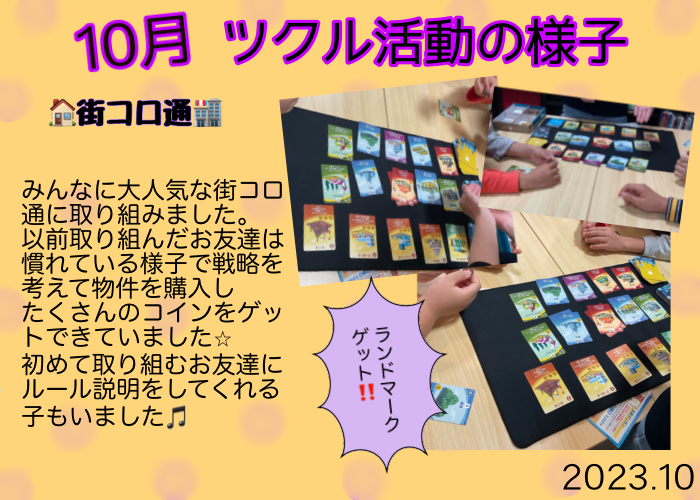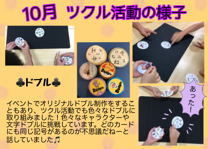 今月は、ドブル、街コロ通、室内お買い物、ハロウィンプラバン制作などに取り組みました!