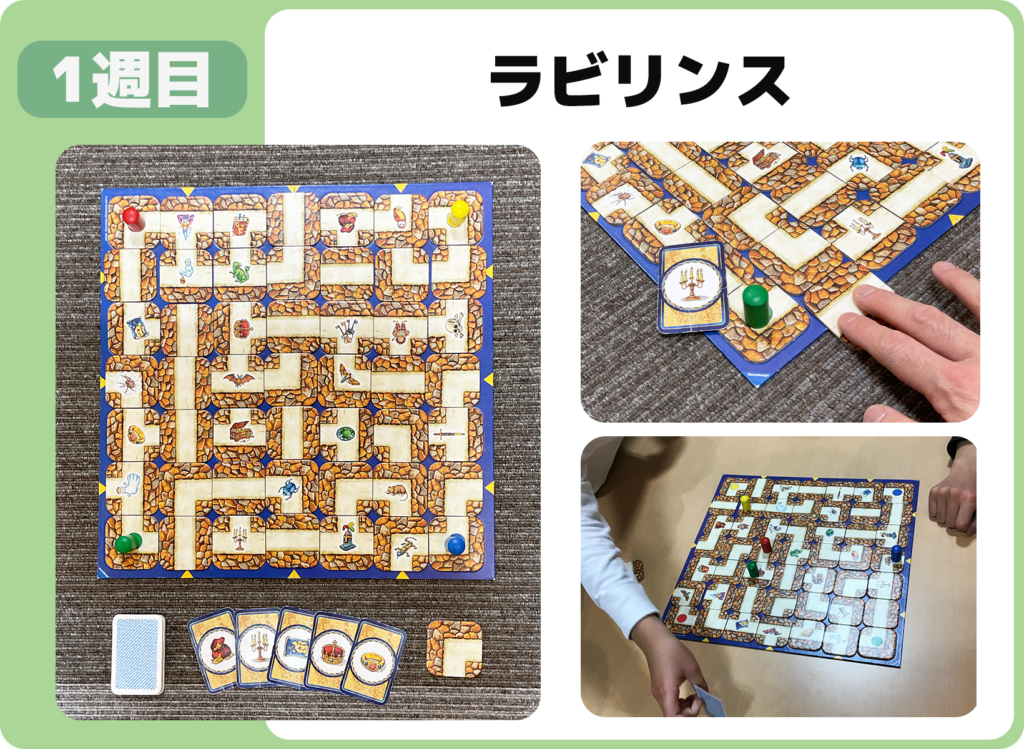 財宝カードで示された宝物を集めるため、迷路の通路をずらしながら進むゲームに挑戦しました。相手が道を変えるたびにルートを考え直す必要があり、先の展開を読みながら取り組みました。