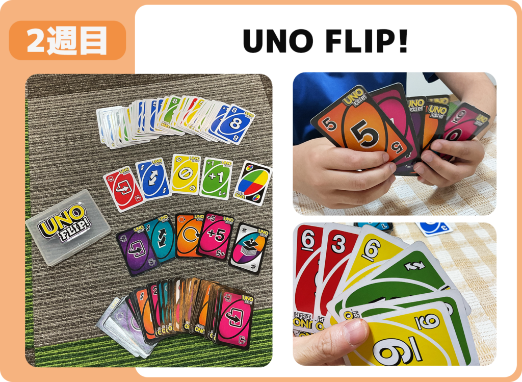 表裏2種類のカードが切り替わる UNO FLIP! をプレイ。カードが裏面にひっくり返ると特殊効果も変わるため、思わぬ展開にみんなで驚きながら楽しみました。
