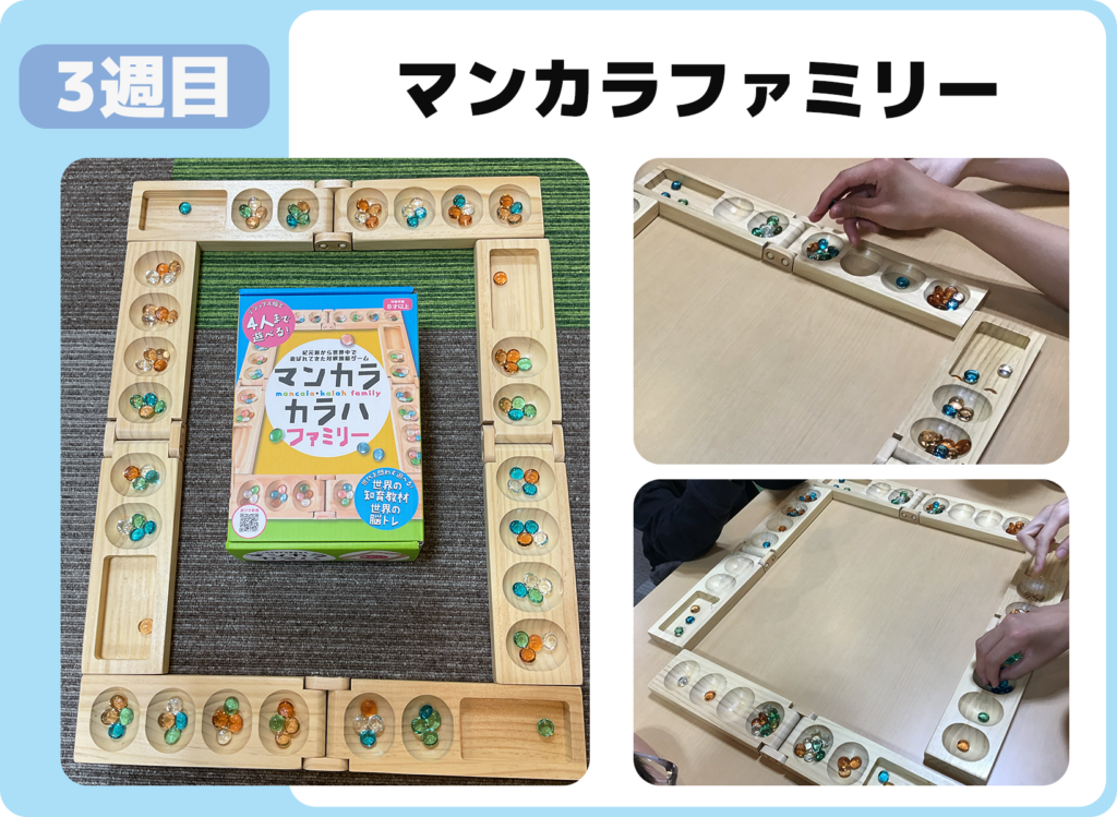 4人で遊べるマンカラに挑戦。石を動かす順番と相手の手を考えながら、先を見据えた一手を決めています。上手く自分の考え通り進めた時は、嬉しそうな表情を見せてくれています。