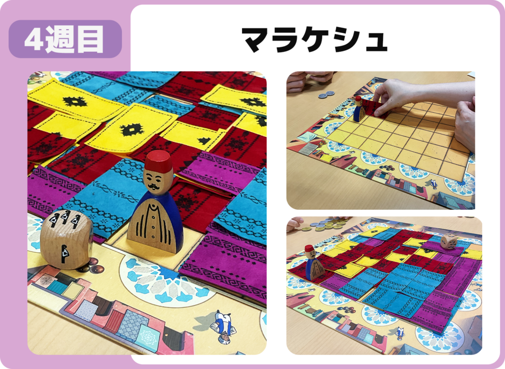 サイコロを振って商人を動かし、絨毯を敷き詰めるボードゲームです。相手の絨毯上に止まった時は支払いが必要なため、絨毯をどのように置くかじっくり考えながら進めました。