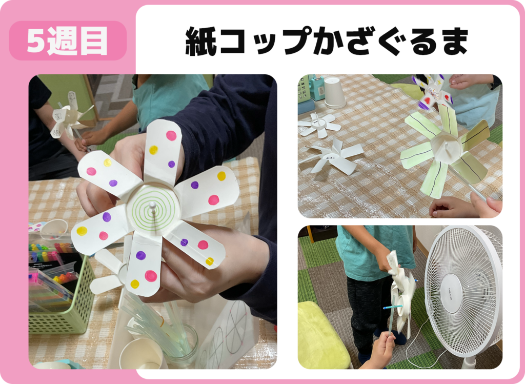 紙コップに絵を描き、ストローと羽根を取り付けてかざぐるまを製作。色や模様を工夫してオリジナル作品を完成させ、最後に息を吹きかけて回転を確かめました。
