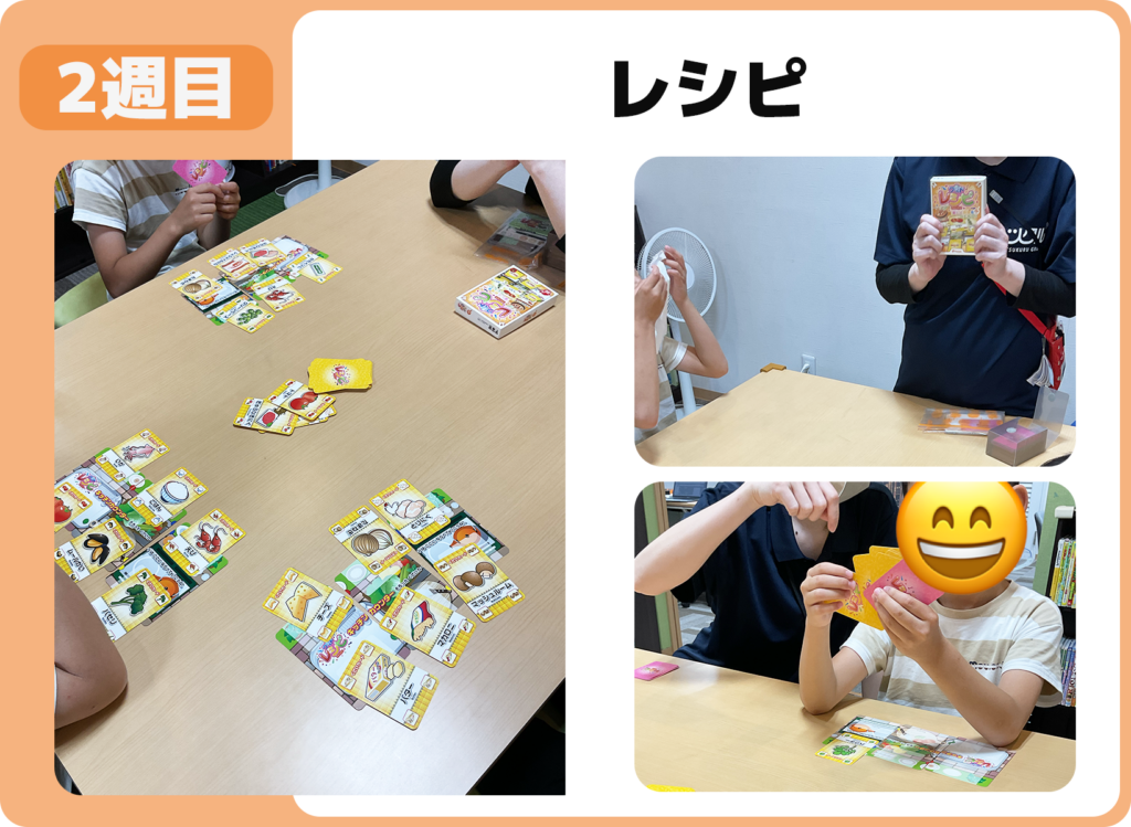 人気カードゲーム「レシピ」に取り組みました。和食レシピ・ワールドレシピの2デッキをプレイし、日本の定番メニューと世界の料理を食材集めをしながら楽しく取り組みました。