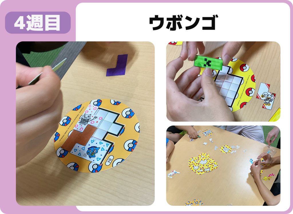 自作ピースを使ってウボンゴ!制限時間内にボードを埋めるスピード勝負で、集中力と空間認識力がぐっとアップ。互いにコツを教え合いながら、白熱したゲームを楽しみました。