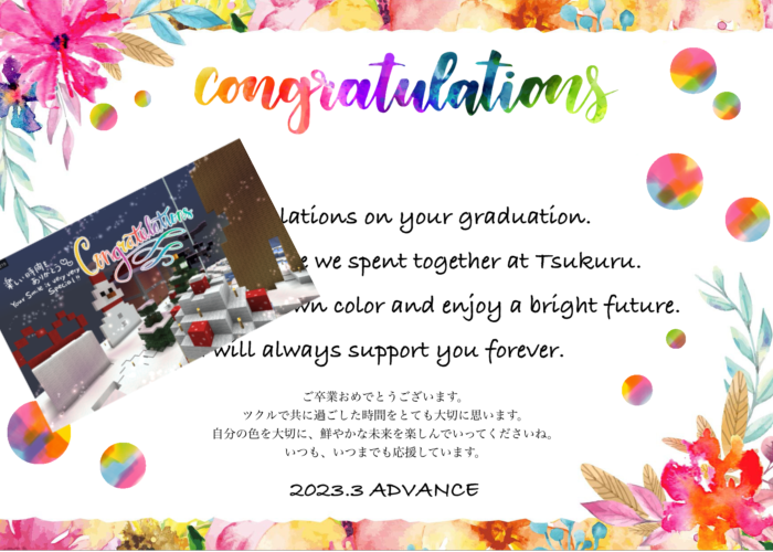 卒業の記念には、スタッフからの寄せ書きと、卒業証書、そして、昨年みんなで作ったマイクラワールドの写真を添えたタンブラーなどをプレゼントしました。