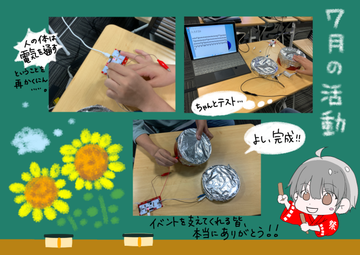 アルミホイルと空き箱で作った太鼓と基盤をコードで接続し、接触型のコントローラーを作成しています。プレイする際に手か足にコードと繋いだアルミホイルを巻くことで、コントローラに触れると微弱な電流が体を通って通電し(本当に微弱で体への影響も痛み等を感じることもありません)太鼓に触れたと判定される仕組みになっています。