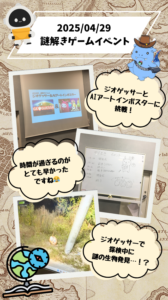 今回は、謎解きゲームイベントとして、ジオゲッサーとAIアートインポスターの2種類の活動に挑戦しました。