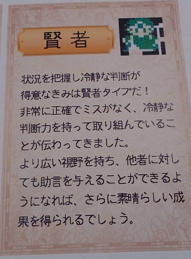 ※ジョブカード 訓練結果により適正と称したジョブ(商人⇒電卓計算の結果良い 勇者⇒平均して良い等々)