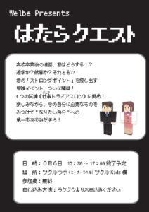 はたらクエストとは「就労訓練を楽しく体験してみよう!」をテーマに、4種類の訓練を体験し結果に合わせたジョブカードがもらえるイベントです!