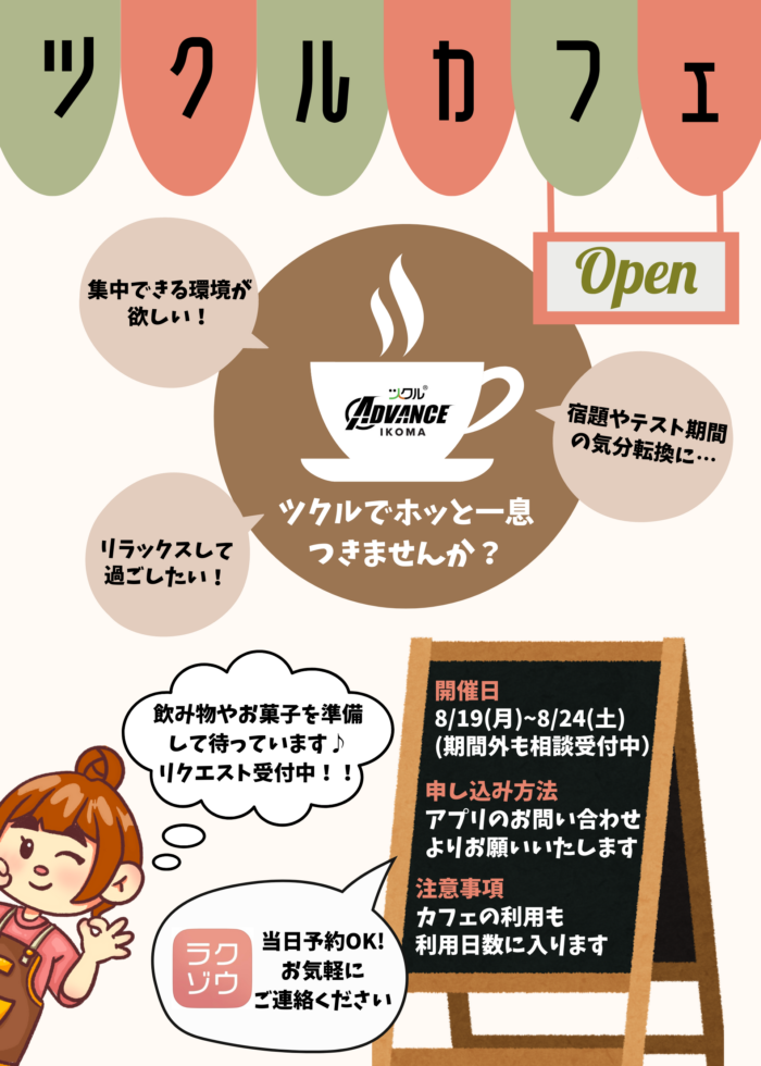 8月もツクルADVANCE生駒校をよろしくお願いします!