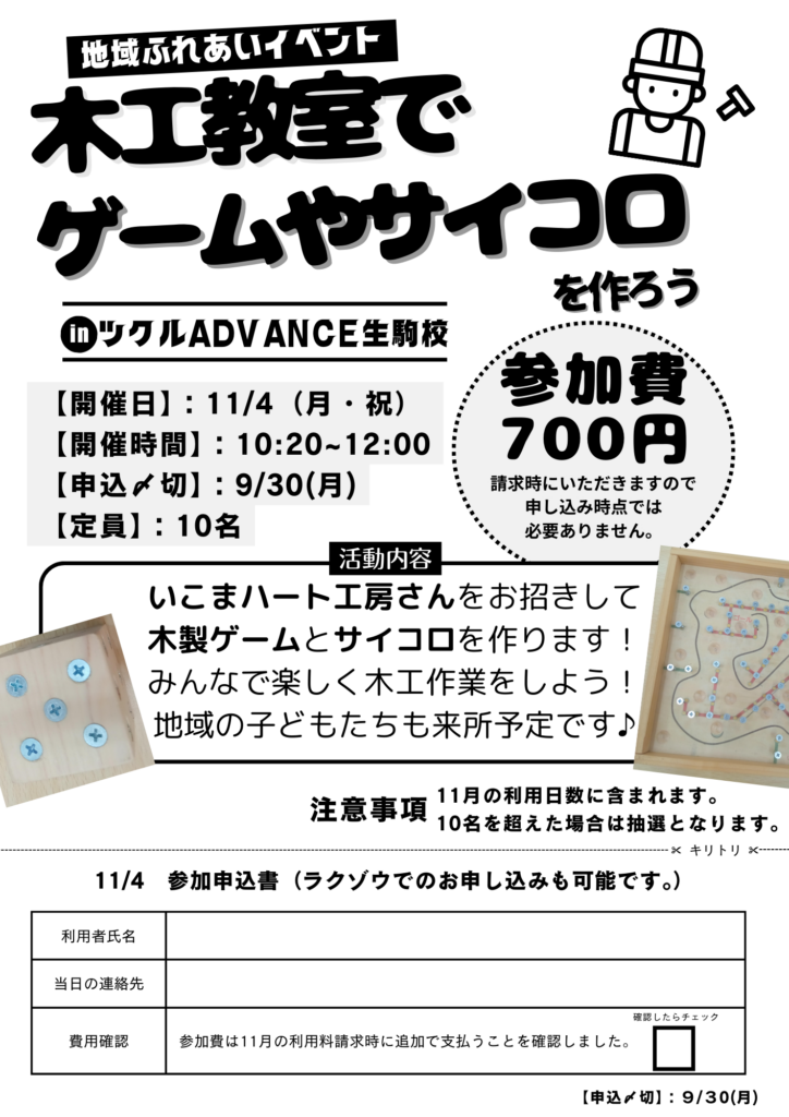 11月4日に『木工教室でサイコロやゲームを作ろう』を開催します。