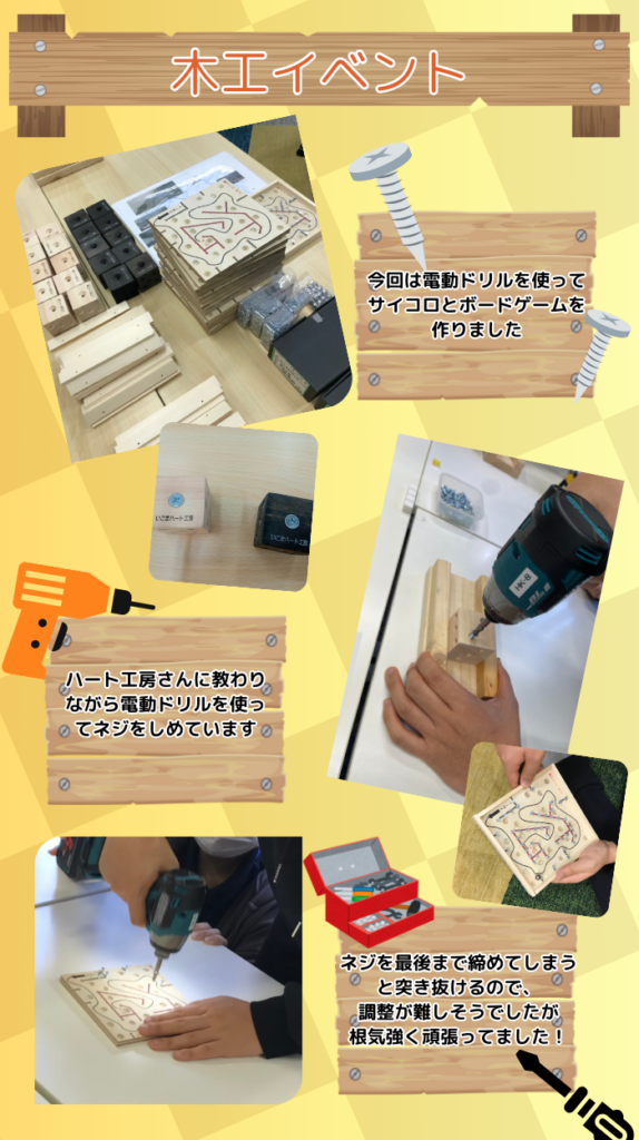 最新の電動ドリルを見て少し驚きながらも、ハート工房のスタッフの方々が親身に教えてくださり、少しずつネジ締めが上達していきましたね。慣れない作業でしたが、根気強く取り組むことができました!