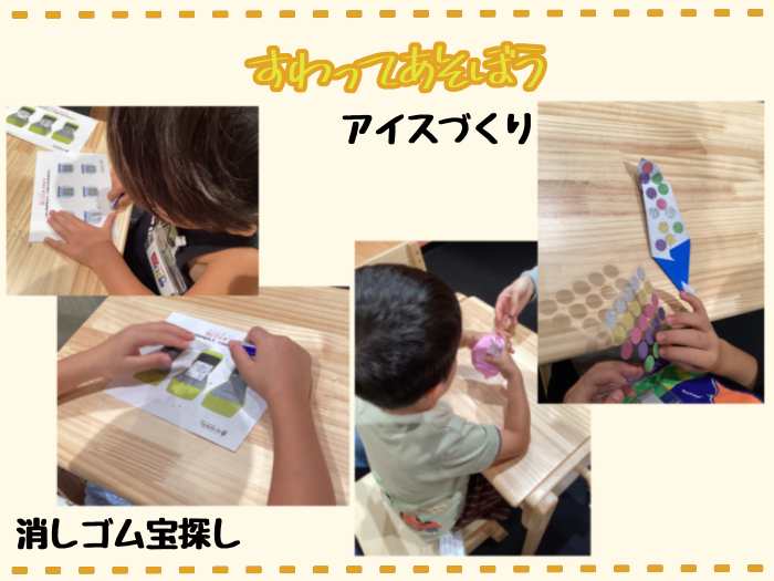 消しゴムを使う練習をするため、スクラッチカードを行いました。鉛筆で塗りつぶされた枠の中を消しゴムで消して、隠された絵を探すプリントです。スタッフが説明した通りにしっかり消しゴムを使うことができていました。塗りつぶした上からイラストが透けて見えているかのような絵をスタッフが描いておいたため、「ここもう見えてるやん!」と余裕そうに消し始めた子どもたち…絵も一緒に消えていくため「え???」と大混乱。「これ偽物や!」「本物はどこなん???」と一生懸命消し、見つけると「ここにあった〜!」と大喜びでした。
