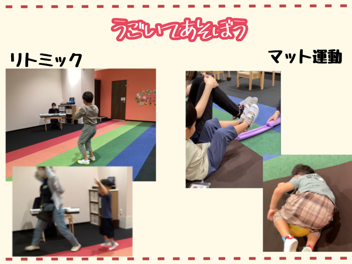 体幹を鍛えることをねらいに、マット運動を行いました。最初は簡単な動きからで、寝転んでマットの上をゴロゴロ。みんな上手に体を伸ばして転がっていました。その次は膝を抱えた状態で横に転がったり、ボールを足に挟んだりした状態で転がってみました。上向きから横になることや伏せることはスムーズなのですが、手や足を補助的に使うことが出来なくなるため、伏せた状態から上を向いた状態に戻るまでがちょっぴり難しく、頭で床を押したり勢いをつけたり、お腹にググッと力を入れながら何とか起き上がろうと頑張り、転がることが出来ました。色々な動きをして、「次はどんなことする?」と楽しみながらマット運動に取り組んでいた子どもたちでした。
