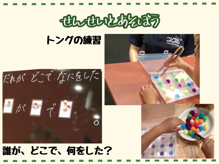 手先の巧緻性を高めることや、お箸や鉛筆を正しい持ち方で持つための練習として、トングで物を掴む遊びをしました。今回は、マッチングも兼ねて柔らかいポンポンを同じ色の枠へ入れていく遊び方で行なっています。初めて触るトングに大喜びの子どもたち。掴みたいものに狙いを定めてトングを動かし、手先を動かして挟んで、入れたい枠のところまで運んで、離す…とっても集中して繰り返し取り組んでいました。片手で扱うにはトングは少し固かったようで、終わり際には「手が疲れた」と話す子もいましたが、頑張って最後まで取り組むことが出来ました。
