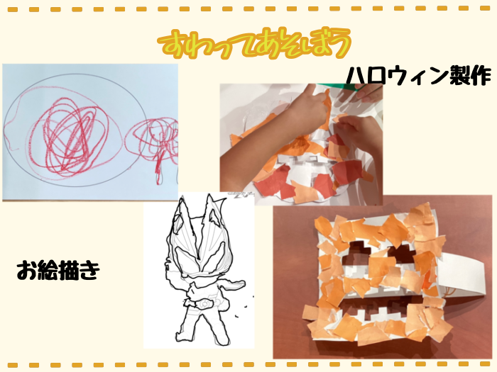 10/31はハロウィンということで、ちぎり貼りでかぼちゃのお面を作りました。手先の巧緻性を高めることや、季節を感じることをねらいとしています。まず始めに普通のカボチャかマインクラフトの飾りカボチャ2種類のお面から選んでもらいました。次にオレンジ系の色の折り紙から好みの色を3枚、それぞれ選んでもらい、ひたすらちぎっていきます。スタッフが「これくらいの大きさにしてね」と見本を机に置くと、それと見比べながら小さく小さくしていました。ちぎった形がちょっと変わった形になっているのを発見すると「ねぇみて!こんな形にちぎれたよ」とスタッフに報告してくれる子もいました。全部ちぎれたらお面にどんどん貼っていきます。「いっぱい貼らないとだめだね」「もう少しで時間終わっちゃう」と残り時間を気にしながら、白いお面をオレンジ色のかぼちゃのお面に変身させることができました。糊が乾いた後はお面をつけてにっこり笑顔の子どもたちでした。