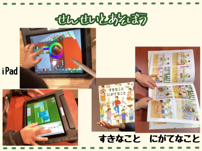 ICTツールに親しむことをねらいに、iPadアプリを使用した活動を行なっています。ペイントアプリでカレンダーの製作をしたり、論理思考を養うパズルのアプリをしたりしました。カレンダー製作ではペイントアプリでお絵描きをしています。年少さんは、画面の表示が変わったりいろんな線が描けたりすることに興味津々!ぐるぐるとなぐりがきをしたり、アプリの中のいろんな機能をとにかく触ってみたりして楽しんでいました。年中・年長さんはアプリの使用も慣れており、わからないことがあればスタッフに聞いていますが、イメージを膨らませたり、描いた絵についてお話したりして思い思いに楽しんでいます。パズルでは「Pango」や「codekarts」など、キャラクターの通る道筋を考えてプログラムを組むアプリに取り組んでいます。考えた道筋がうまくいかなくても「難しい」と首を傾げながら「こうかな?」「こっちに変えてみよう」と落ち着いて試行錯誤して解くことができ、ゴールできると「やったー」と喜んでいました。
