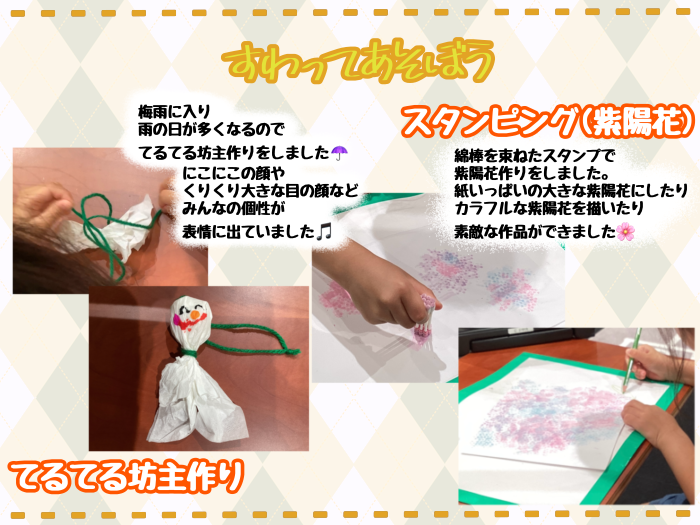 あっという間に梅雨の時期になりました。どんよりとした天気の中でも、体にまとわりつく湿気や暑さから夏の気配が感じられます。ジメジメとした嫌な暑さの中でも、元気いっぱいの子ども達にスタッフも元気をもらっているこの頃です。6月の活動の様子をお伝えします。