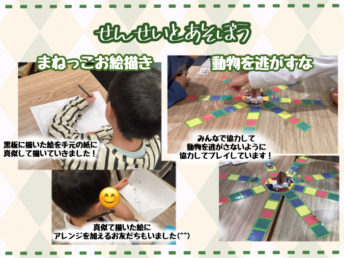 まねっこお絵描きや、動物を逃すなというルールのあるゲームに取り組んでいます♪