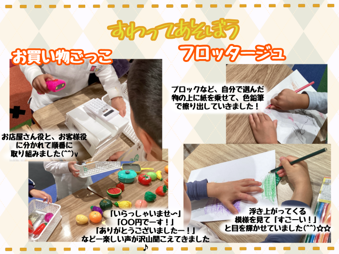 お買い物ごっこでは、店員さんとお客さんに分かれてそれぞれの役を、