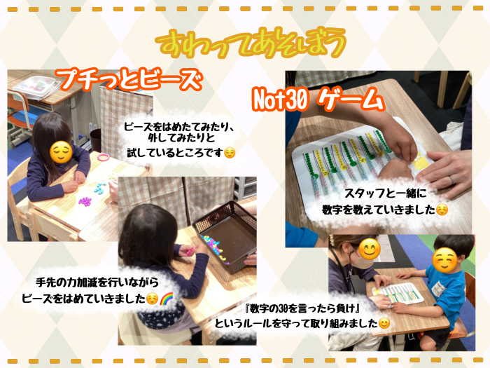 プチっとビーズや、Not30ゲームなどを行いました☆
