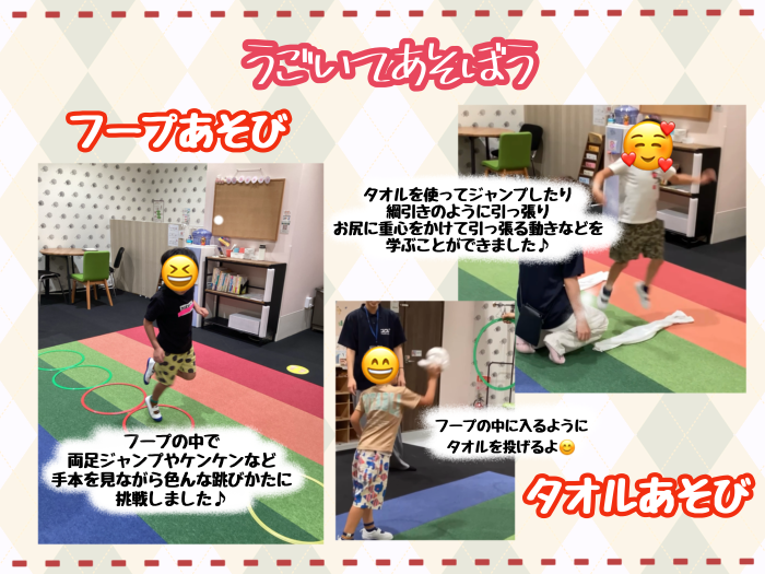 動の活動ではフープやタオルを使って、元気いっぱい身体を動かしています♪