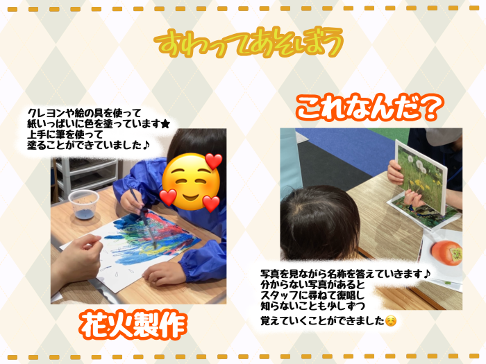 水分補給をしっかり行い、子供たちの体調管理に気を付けながら、今月も楽しく過ごしていきたいと思います!